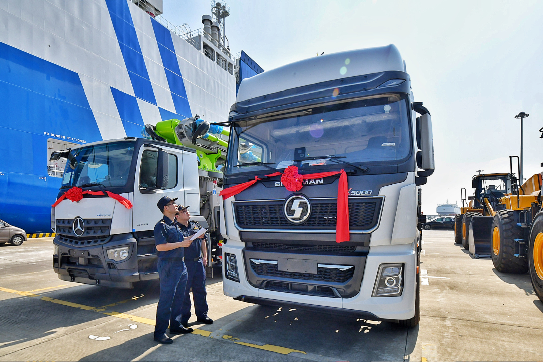 广州海关所属南沙海关关员对即将出口重型卡车进行监管。