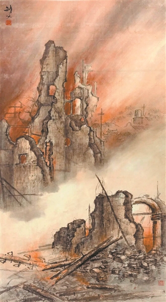 “和现实生活有关的,方才是有价值的艺术。”将“艺术大众化”视为革命目标,传统文人的“山林逸气”对高剑父来说已显得不合时宜。高剑父尝试将“现代事物”如飞机、汽车、电线杆等引入中国画中。他还特意乘机翱翔,在空中写生。高剑父《东战场的烈焰》堪称其“艺术革命”具体、勇猛的实践。该画以1932年“一·二八”事变中被日军炸毁后的上海闸北东方图书馆景象入画:画面上烈焰冲天,火光熊熊,遍地断壁残垣,令人触目惊心。《东战场的烈焰》直接让时局大事进入中国画,可谓首开先河。