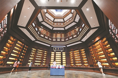 步入中国国家版本馆中央总馆的主建筑文华堂,高高的穹顶让人深深震撼。这里就是国家书房。整个文华堂中央挑空高达13米,面积1350平方米,穹顶上取自宋代石刻天文图的满天星宿璀璨其中,几十个巨型书柜、数万册古今经典,让人叹服于中华文明如星空般的博大精深。总馆文瀚厅里,陈列着珍贵的古籍出版物,集中展示《四库全书》《永乐大典》《古今图书集成》等原大仿真影印本、精选古籍影印本和原雕版刷印本。