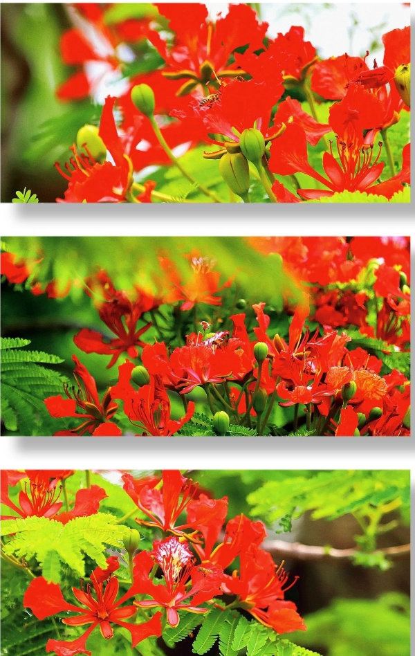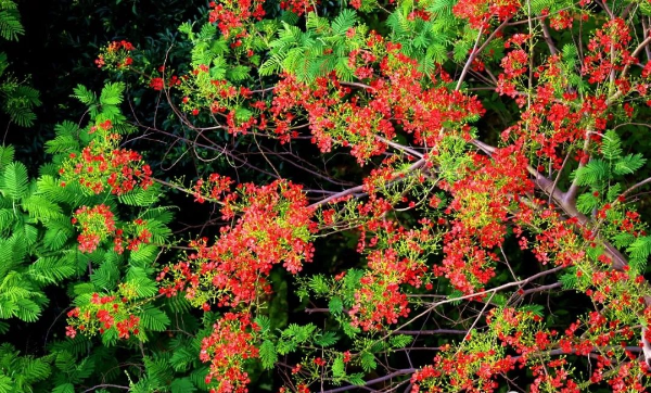 凤凰木树干高且直,花开时满树结花,鲜红的花朵在嫩绿的叶片衬托下,格外绚丽夺目,被誉为世上色彩最鲜艳的树木之一。
