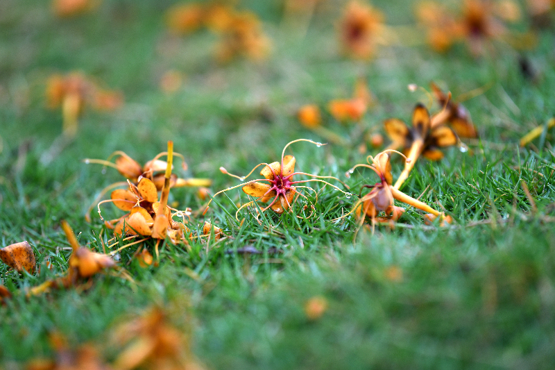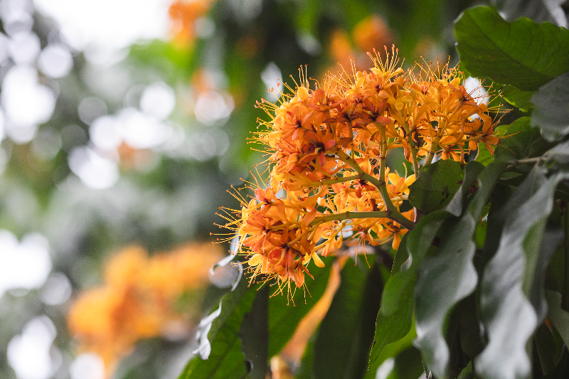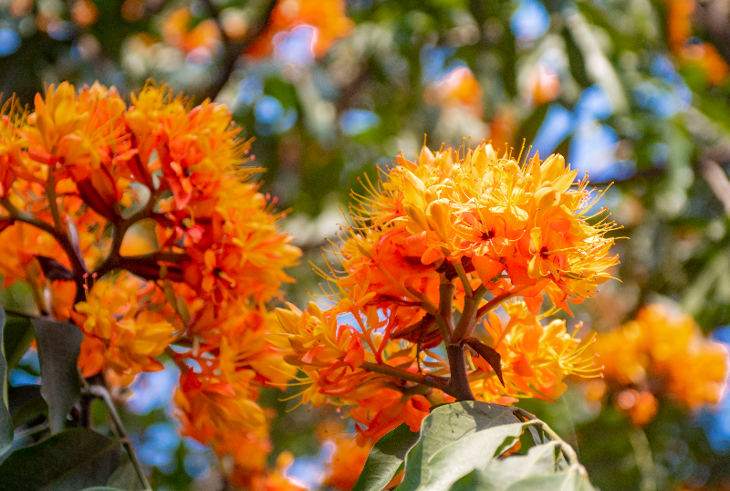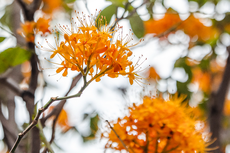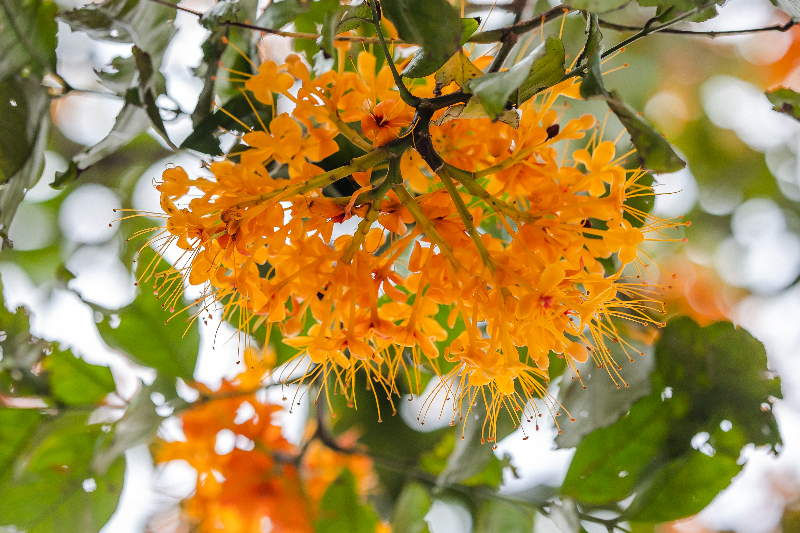 由于无忧花盛花时开满树头,金黄橙红的花朵,像团团跳动的火焰,因此也有“火焰花”之称。看着树冠上覆盖着金黄色的花朵,跃跃向上,动感十足,令人目不暇接,心情也随之舒畅。