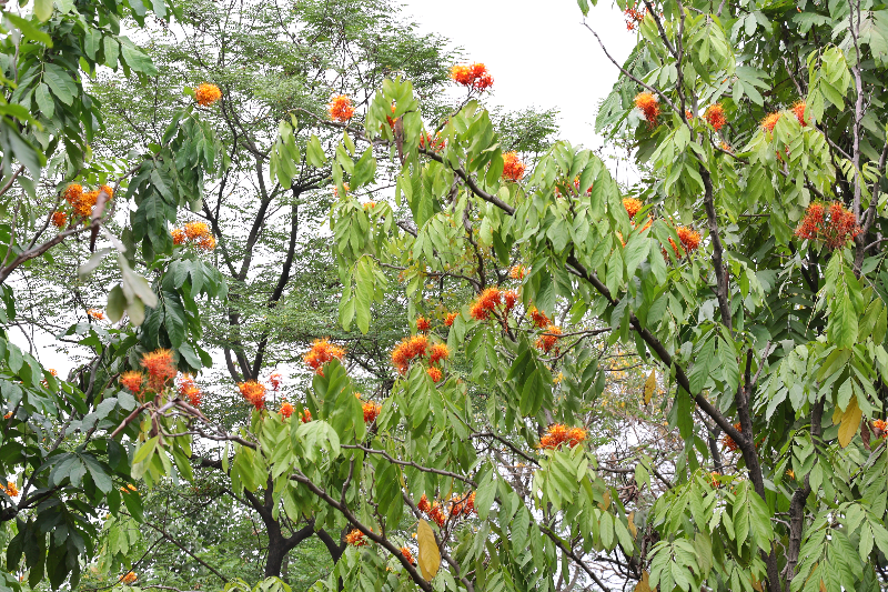 无忧树树冠椭圆状伞形,树姿雄伟,叶大翠绿,花序大型,花期长,盛花期花开满树头,橙红似火焰,有“火焰花”之称。