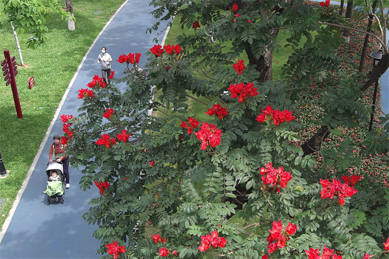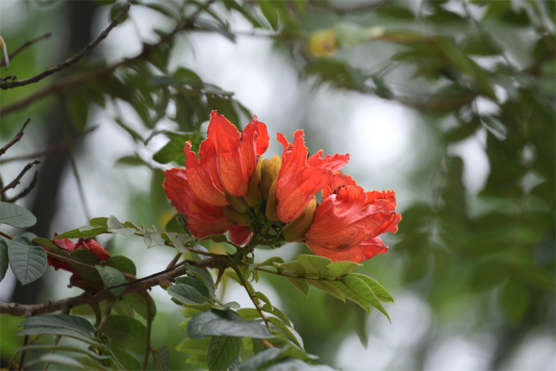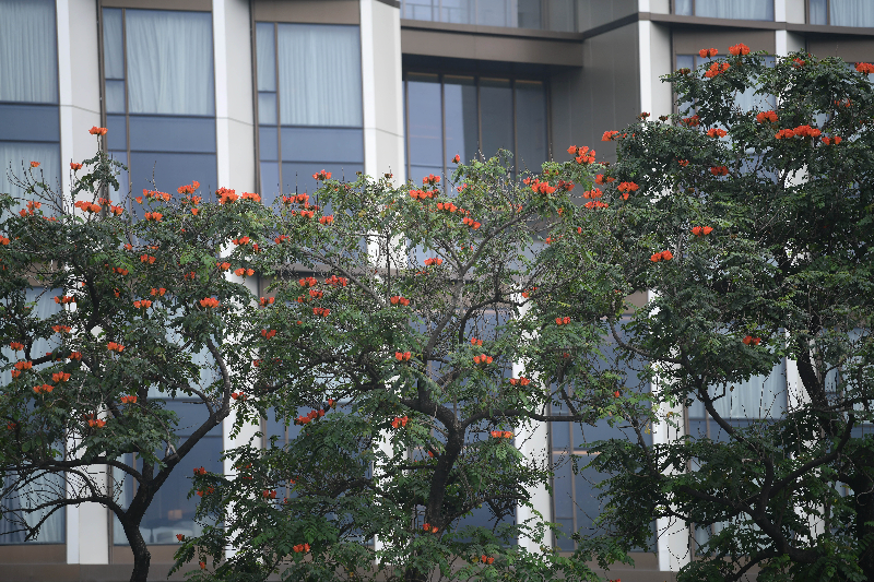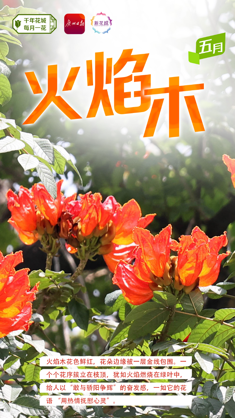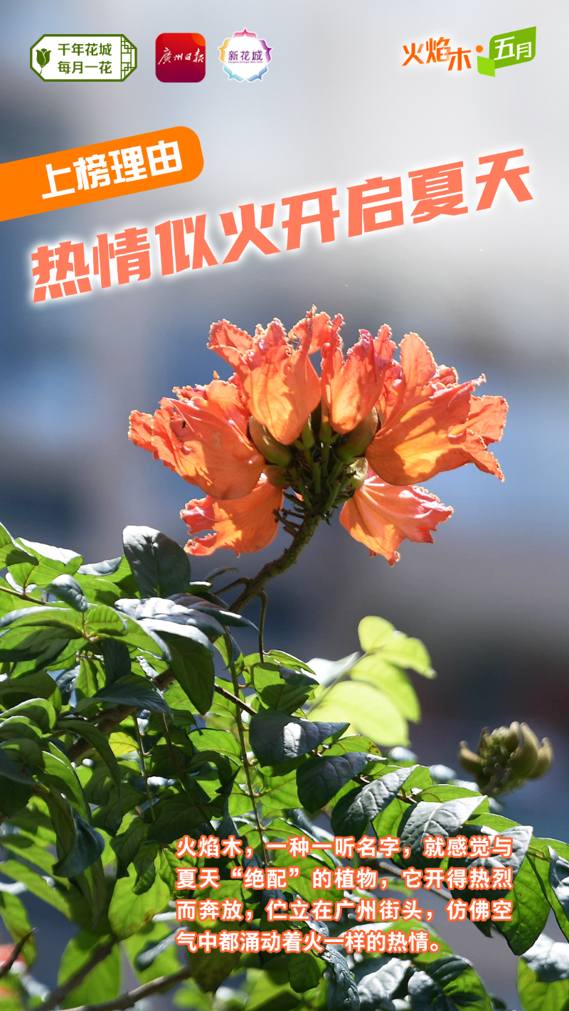 火焰木,一种一听名字,就感觉与夏天“绝配”的植物,伫立在广州街头,仿佛空气中都涌动着火一样的热情。有人说,火焰木艳红的花朵点缀在一片碧绿之中,看起来像熊熊烈焰随时都可能穿叶而出。这是向上生长、冲破阻碍的力量。