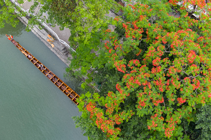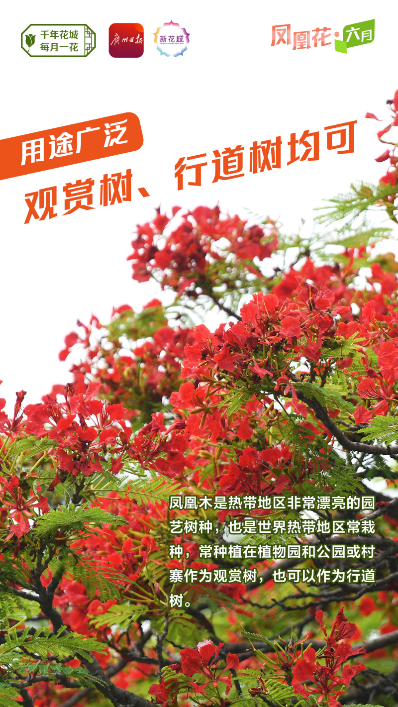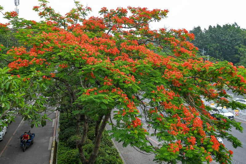 生态爱好者刘先生记得,广州在20世纪60年代就种有凤凰木。在他的笔记里,可以找到1982年对海珠广场一棵凤凰木的观察,“树木很高大,花开时节非常引人注目,有时候感觉花比叶还多,因此每每经过,都忍不住抬头看看。”据其介绍,广州近郊水乡的居民,习惯用“龙船花”或“龙舟花”来称呼它,这是因为凤凰木往往在端午节前后盛放繁花,正值“龙舟水”时节,龙舟竞渡十分热闹。对于人们来说,凤凰木的这一特点也使它成了预告雨季来临的“气象员”。