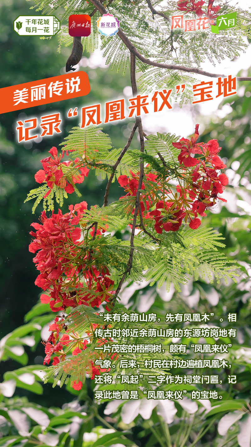 不少广州街坊都喜欢热情洋溢的凤凰木,番禺南村还流传“未有余荫山房,先有凤凰木”的说法。相传古时邻近余荫山房的东源坊岗地有一片茂密的树林,林木葱茏,颇有“凤凰来仪”之气象。村民在村边种植凤凰木作为风水树,还将“凤起”二字作为祠堂的门匾,记录了此地曾是“凤凰来仪”的宝地。凤凰花开时,花朵鲜红炽烈如火,如红云弥漫,有诗赞曰:“得汝清荫胜幔纱,山房一隅铺彩霞。”