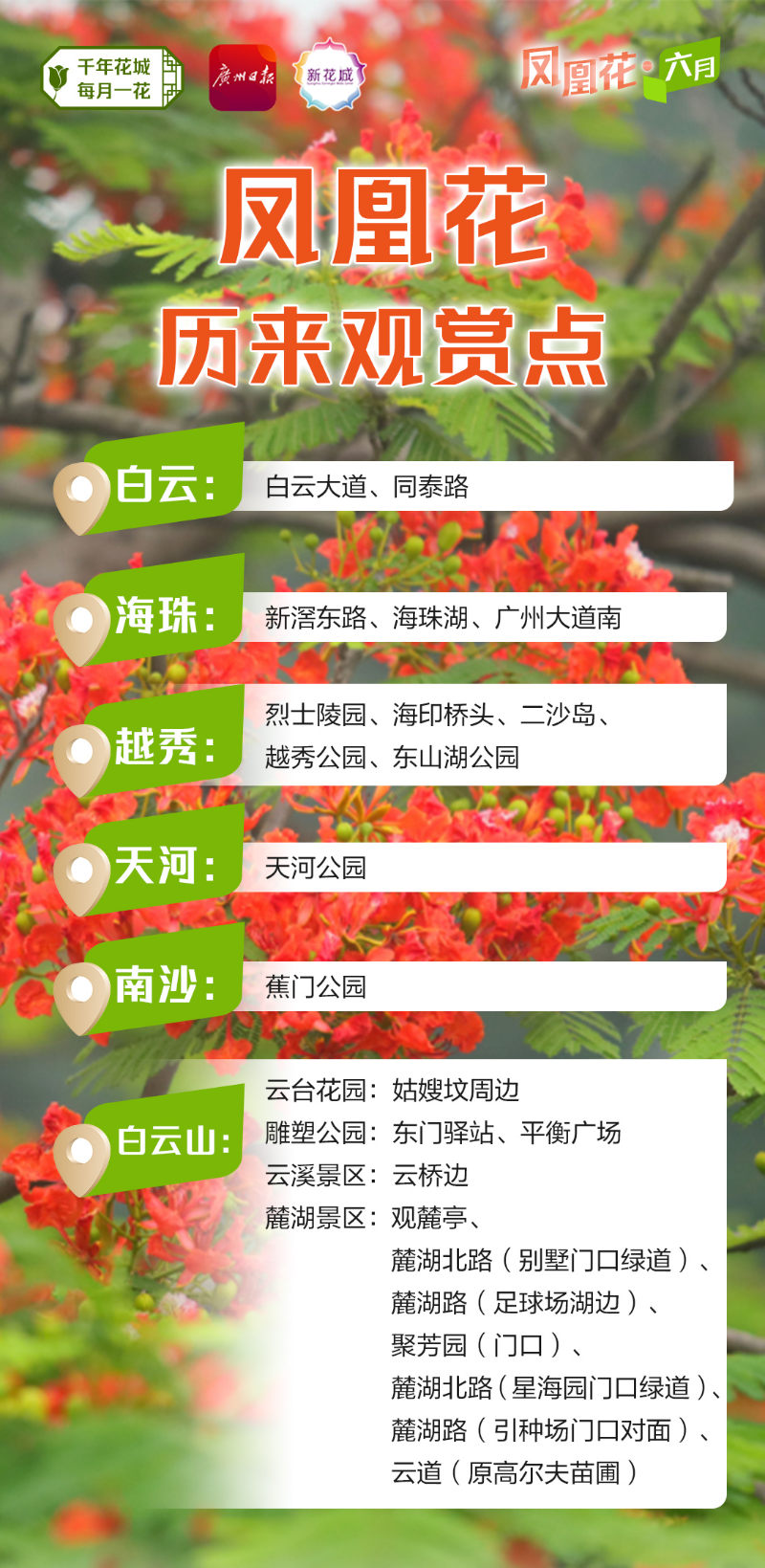 麓湖景区凤凰木:观麓亭、麓湖北路(别墅门口绿道)、麓湖路(足球场湖边)、聚芳园(门口)、麓湖北路(星海园门口绿道)、麓湖路(引种场门口对面)、云道(原高尔夫苗圃)
