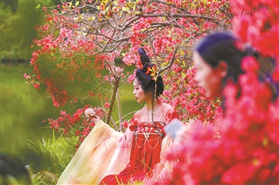 阳春三月,万物苏醒。春风吹绿了枝头青绿的嫩芽,也催开了花城的花海:满城的木棉犹如一团团在枝头上燃烧的火焰,给人热烈温暖、积极蓬勃的感觉;白云山的紫色禾雀花悄然进入盛花期,一簇簇、一串串从老茎藤蔓上垂坠而下,远远望去,如一群群紫色雀鸟翩跹栖息枝头;华南国家植物园几千株映山红效仿自然景观形成小片杜鹃花海,园内奇异植物室精品兰展区的章鱼兰,远远看去仿若一群活泼灵动的小章鱼在相互嬉戏;城市草坪绿化带和园林景区里色彩缤纷的花烟草成为广大市民争先拍照的又一独特风景线;番禺大刀沙岛上的县道X943线联岛路沿线宫粉紫荆花扑面而来,粉色与白色的花朵互相映衬,形成约5公里长的粉色花廊。