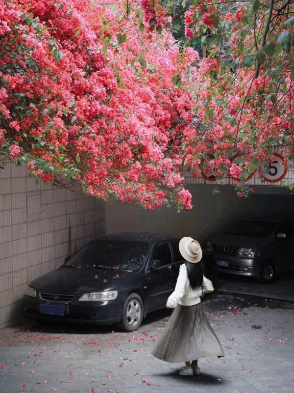 停车场的三角梅正值盛花期,微风轻拂,花瓣纷纷扬扬地落下,走在路上,抬头一看,热烈的三角梅让平凡的日子沾满了浪漫。
