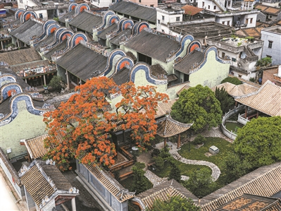 怒放的凤凰花与古祠堂的镬耳、灰塑交相辉映,形成一道独特的岭南风景。