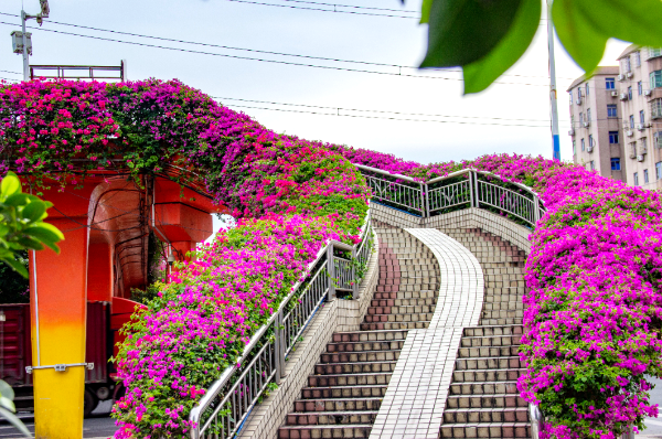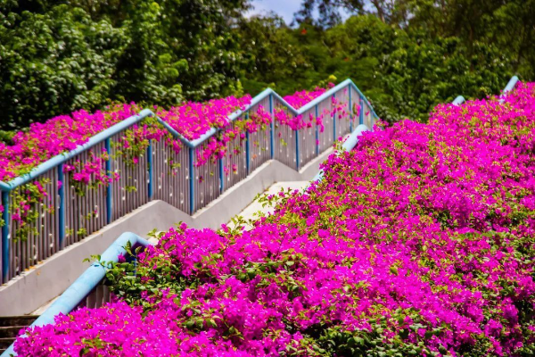开发大道保沙路人行天桥是最“出片”的地方。该天桥全桥绿化长度280米,混种红花、紫花簕杜鹃品种,簕杜鹃一团团、一簇簇,苞片柔如彩绢,像是为整座桥套上了火红色的外衣热烈而奔放。