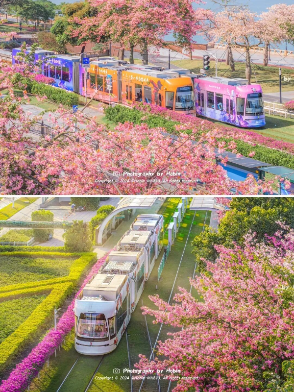 这里是拍摄“列车在花海中穿梭”的绝佳机位!地铁出口草坪树下错位拍摄,当列车从粉色花海中驶过,仿佛走进了动漫场景。