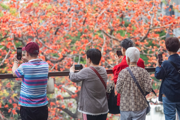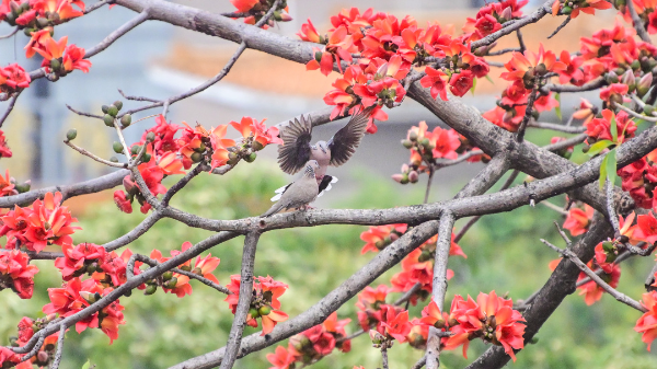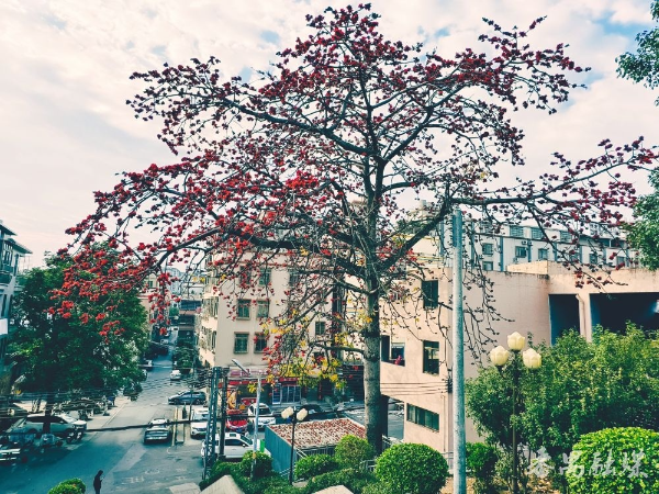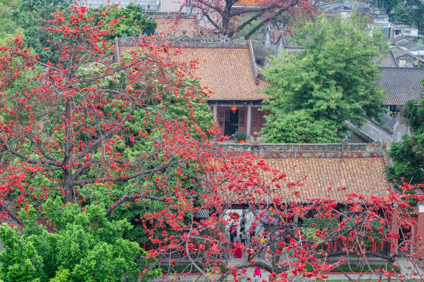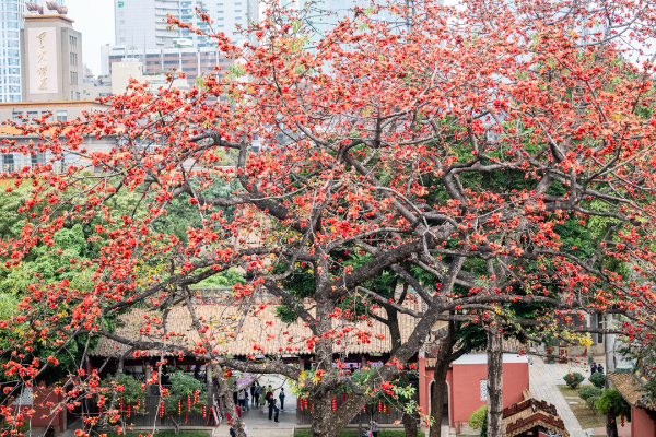 在毛泽东同志主办农民运动讲习所旧址纪念馆,木棉花正迎风怒放,火红花朵与青砖灰瓦、古朴屋脊交相辉映,尽显岭南古韵,吸引不少市民、游客用镜头定格繁花与古建相融的美景。