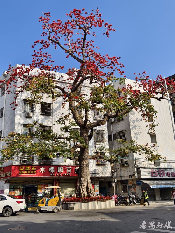 旧水坑村的百年古木棉,红花如火焰般绽放。