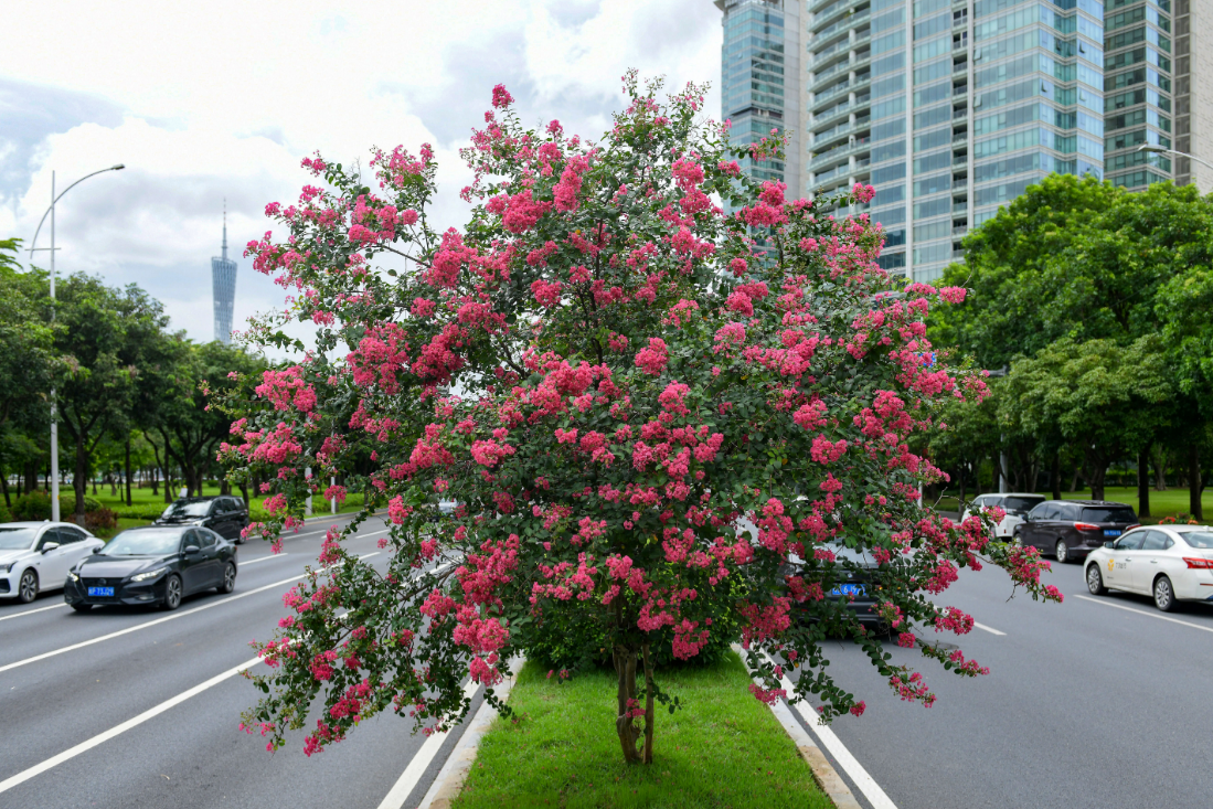 珠江公园是广州小叶紫薇观赏点之一。繁花盛放,与公园管理者们提前策划打造密不可分。一般来说,早在小叶紫薇进入落叶冬眠期时,公园养护工人就对其进行修剪,剪去徒长枝、下垂枝、纤细枝和内膛枝。同时,适当对生长强健、开张角度适宜的一年生枝进行重短截留,培养开花枝,保持树形优美、树势均衡,压低树身,更有利于观花和拍照。
