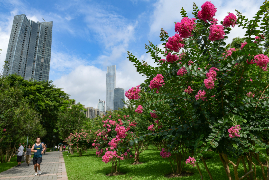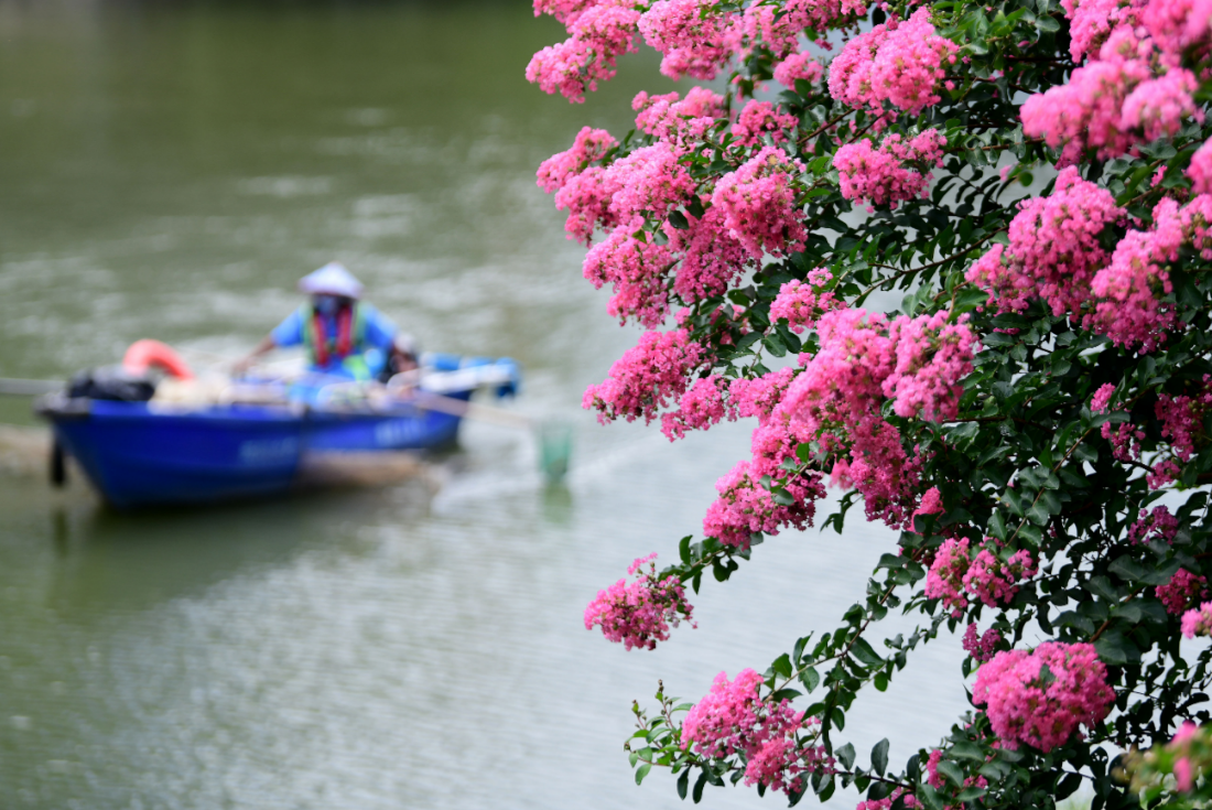 小叶紫薇的叶子较小,花簇沉甸,花色缤纷。一簇簇鲜艳的花朵犹如摇曳的风铃,徜徉其中宛如置身一片万紫千红的花海,吸引不少市民游客拍照打卡。