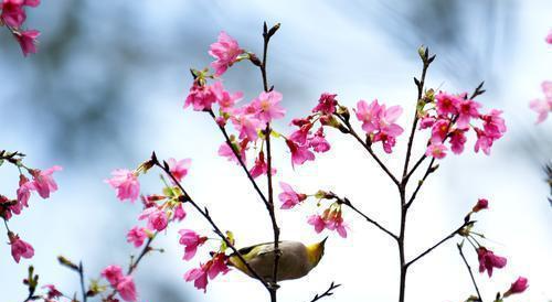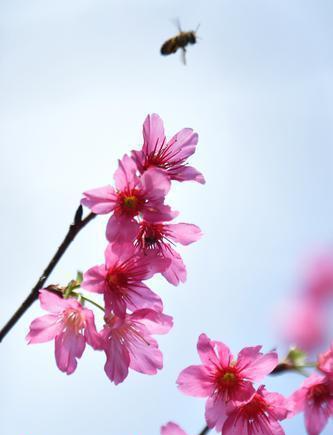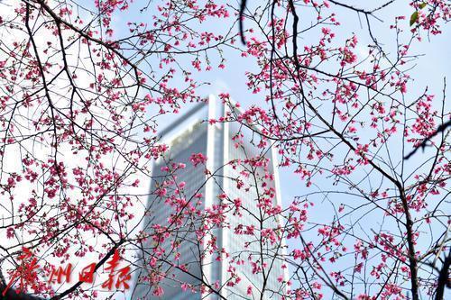 广州春来早,珠江公园百花园内的樱花竞相绽放争相报春。珠江公园种植的樱花主要为“中国红”品种,花呈玫红色,花开满枝时,千娇百媚满树烂漫,不时吸引着蜜蜂环绕,绣眼鸟也常常在花间采食花蜜。