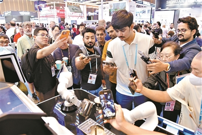 咖啡机器人吸引了众多采购商驻足观看。