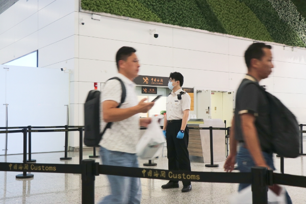 广州海关所属广州白云机场海关关员在广州白云机场口岸对入境旅客进行监管。