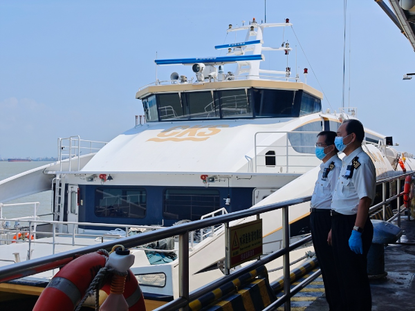 广州海关所属南沙海关关员在南沙客运港口岸对即将发往中国香港地区的客运船舶进行监管。