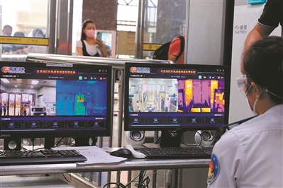 在广州火车站西广场入口处,工作人员手持金属探测器,对进站乘客进行简便安检;在进口站,工作人员确认乘客戴好口罩后才能让其入内;随后,工作人员查验乘客身份证与车票,并进行人像核对,然后对人与物进行详细安检并进行红外体温检测,乘客通过后,才能进入车站。