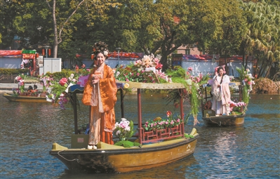 岸上鲜花盛开,水上花舫飘香——以“荔枝湾”“泮塘古村”“西关小姐”“十三行”等文化旅游名片命名的特色花舫在荔湾湖湖面巡游,述说着岭南文化的温情与厚度,场面华丽壮观,全域皆景,精彩纷呈。