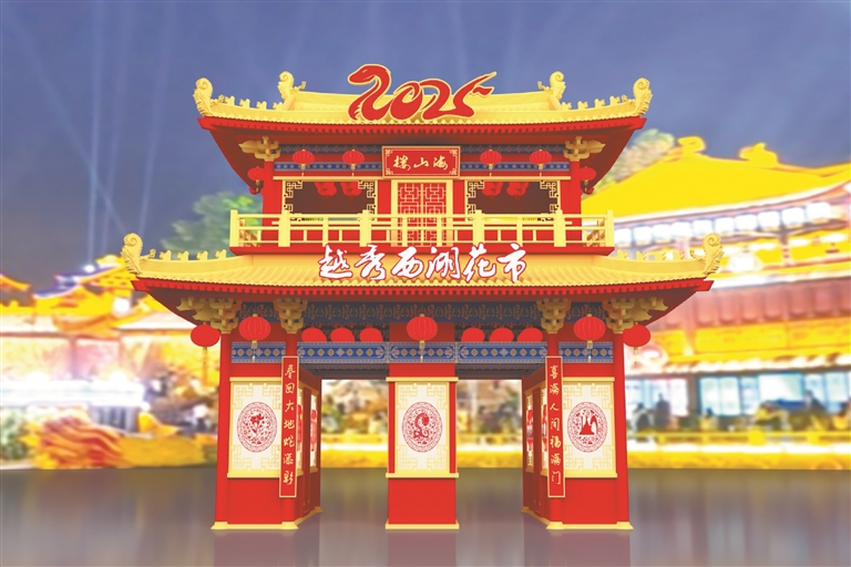 2025年越秀西湖花市以“古越今秀老城市·百年花市新活力”为主题,延续“百年花市,源于越秀”的历史传承,持续擦亮“广州过年 花城看花”品牌。主牌楼以北宋“海山楼”为原型设计。