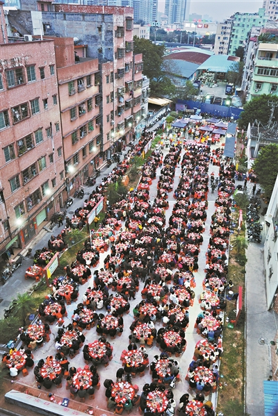 广州萧岗村去年设千桌宴闹元宵。