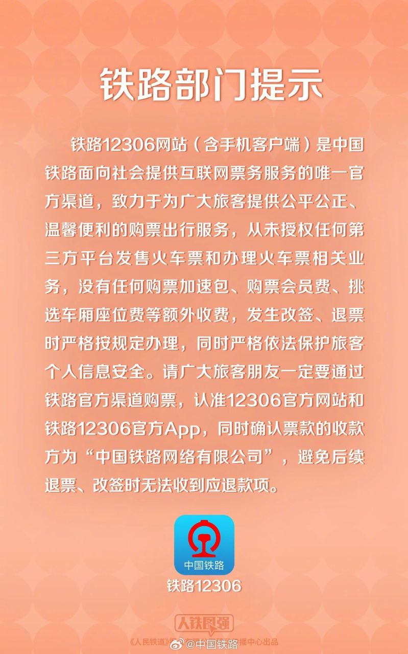 请广大旅客朋友一定要通过铁路官方渠道购票,认准12306官方网站和铁路12306官方App,同时确认票款的收款方为“中国铁路网络有限公司”,避免后续退票、改签时无法收到应退款项。