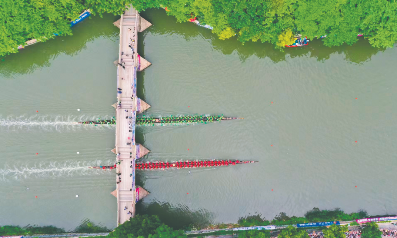 最先出场的是人和镇人和六村龙舟队、金沙街沙凤联社龙舟队,比赛一开始,两支队伍喊着整齐的龙舟号子,快速穿过古老的石井桥,上演了“双龙出洞”的精彩瞬间,吸引了两岸观众纷纷拍照留念。