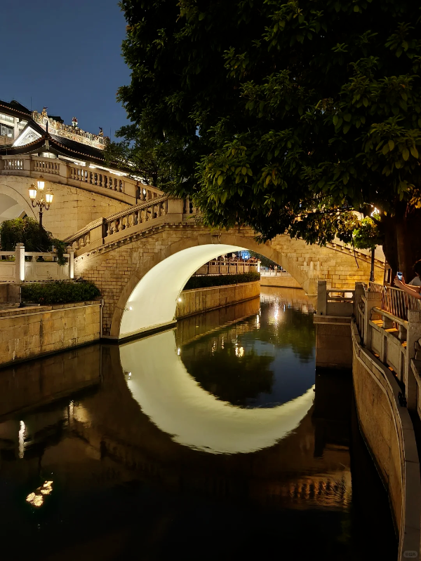 月亮桥是荔枝湾涌的标志性景观,夜晚灯光亮起时,桥身倒映在水中宛如一弯明月,桥影与光影交相辉映。廊桥横跨荔枝湾涌,与两岸民居交织成画。