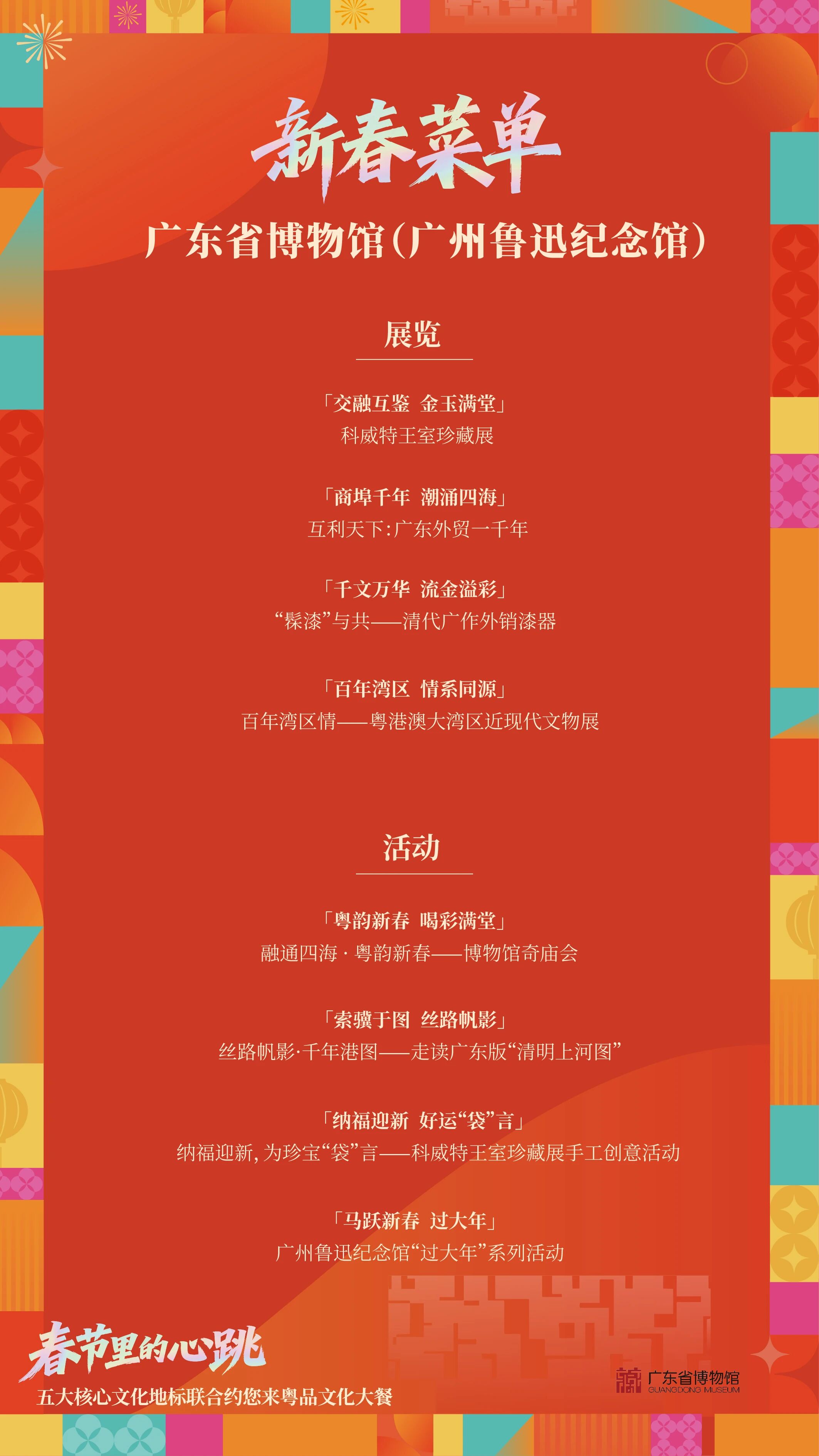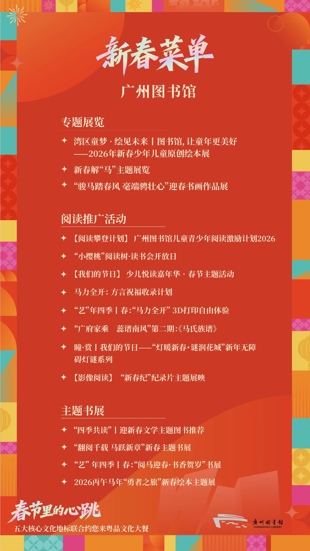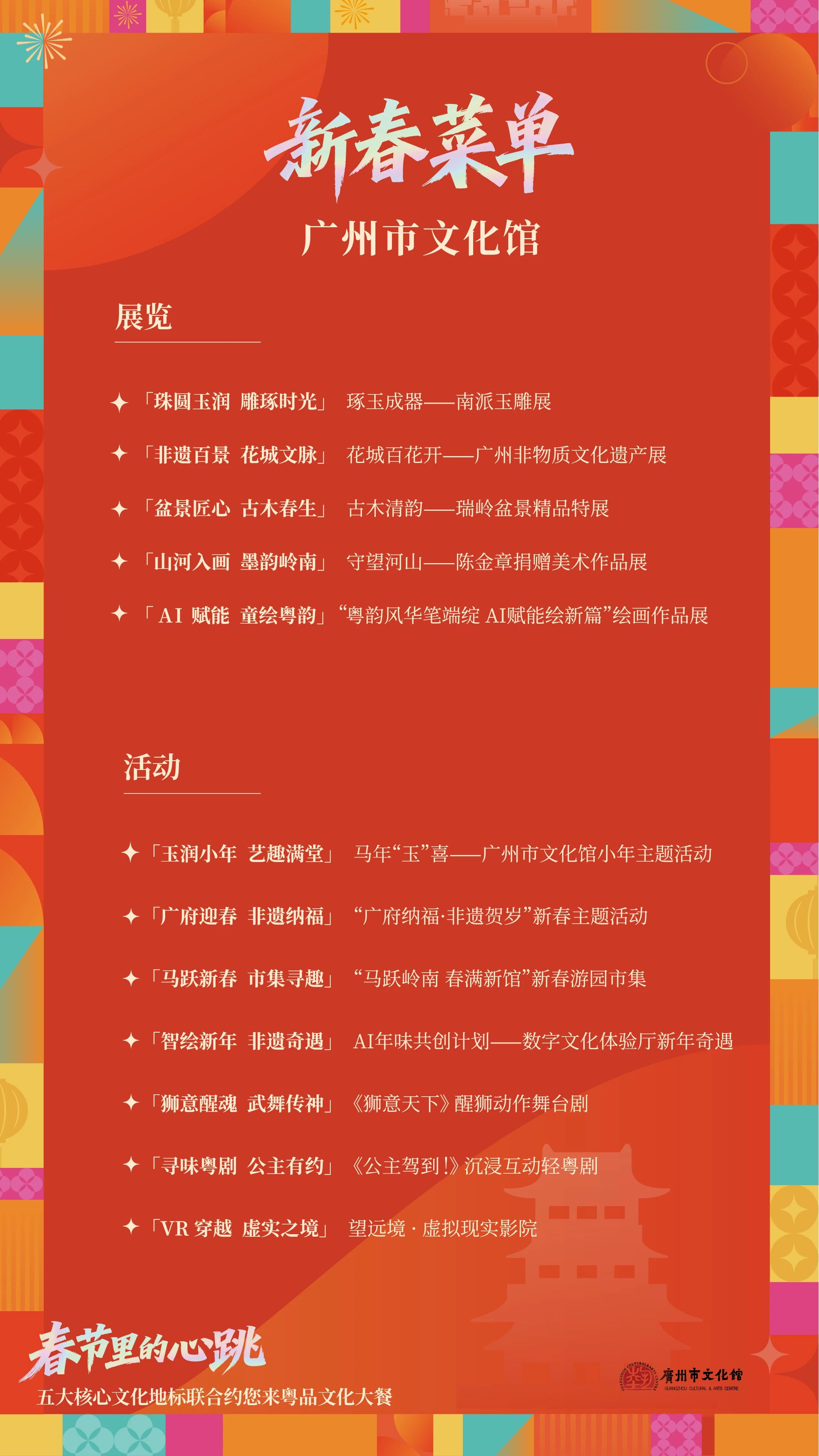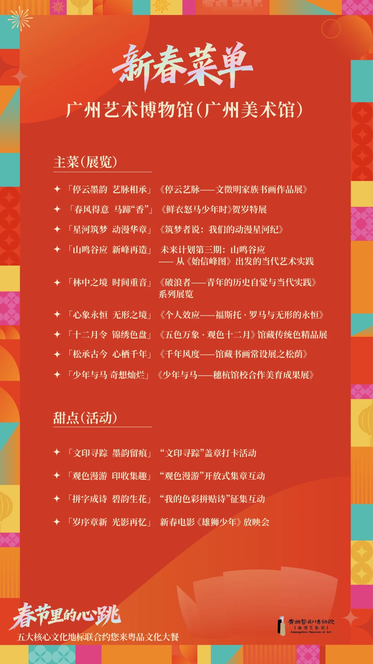 广州中轴线五大核心文化地标——广州艺术博物院(广州美术馆)、广东省博物馆(广州鲁迅纪念馆)、广州图书馆、广州市文化馆、广州大剧院联合发布新春攻略,用一份诚意满满的“文化菜单”,向全国发出最诚挚的邀约:来花城,过个艺术年、文化年!