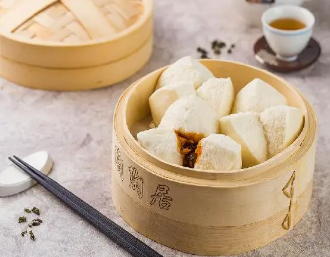 叉烧肉粒以鲍汁芡拌入馅,老面种发面,师傅手作捏成雀笼形。旺火蒸至自然爆开,入口松软香甜细腻。