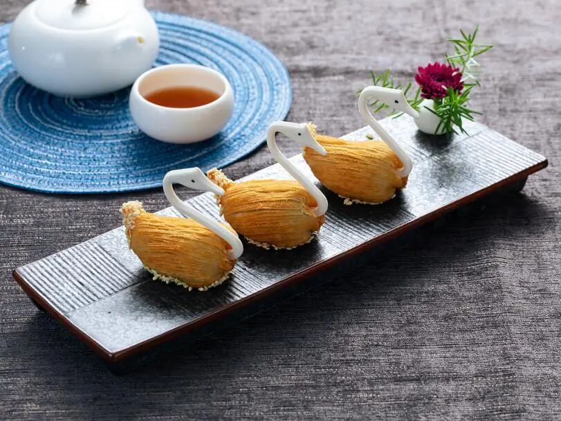 选用自家农场养殖的马冈鹅制馅,鹅味香浓,造型精致,极具特色。