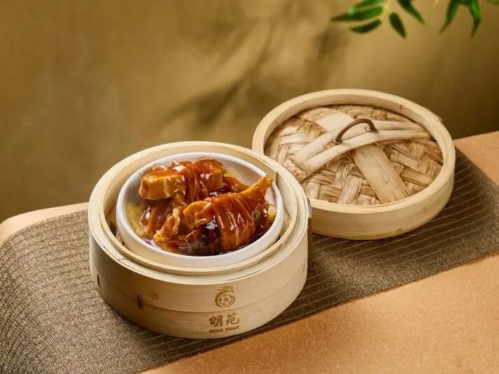 老广怀旧经典点心,鸭脚、香芋条、冬菇等用腊鸭肠扎制,慢煨入味后淋醇厚鲍汁,软糯鲜香,鲍汁浓郁挂味。