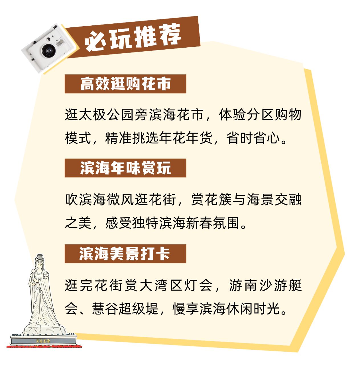 🌸 花市亮点:分区明晰,逛吃省心。分区购物规划清晰,堪称 J 人的理想花街,品类分区明确,选购年花高效又舒心,滨海微风送来阵阵花香,年味与海味交融。