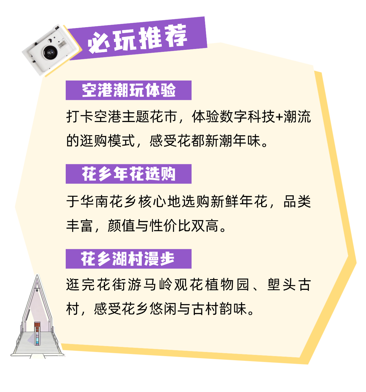 🌸 花市亮点:空港+花市,潮玩无界。以“空港”为主题,融合潮流元素与数字科技,打造沉浸式潮购场景,作为华南花乡的核心阵地,年花品类丰富,颜值与性价比双高,够潮够好逛!