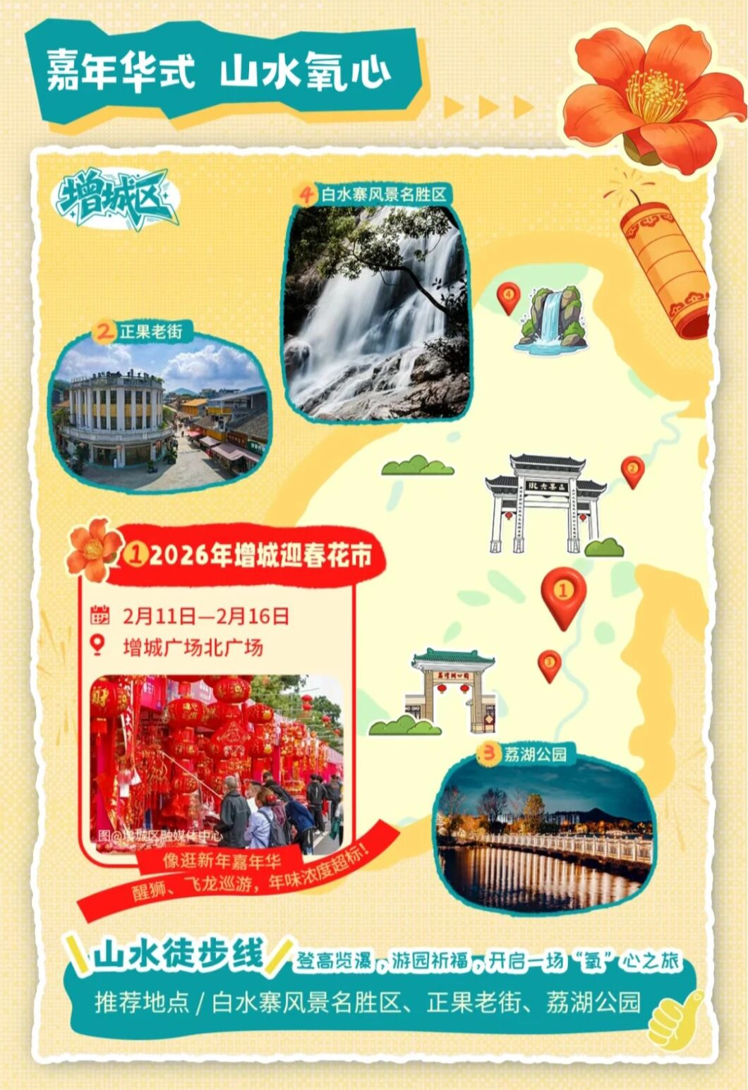 增城广场花市年味拉满,醒狮、飞天龙凤轮番上演,打造新年嘉年华式花市,搭配山水徒步线,解锁新春“氧”心体验。