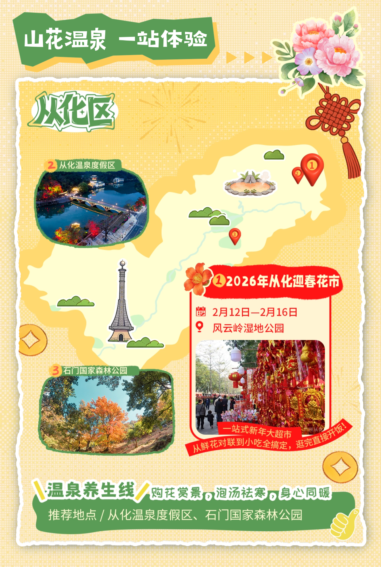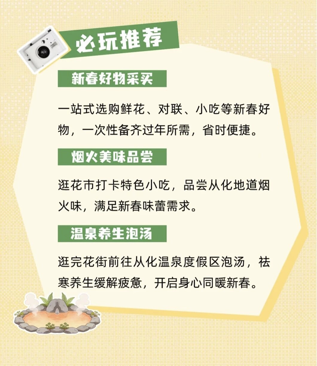 🌸 花市亮点:山间花市,温泉暖意。一站式新年大超市,鲜花、对联、小吃应有尽有,烟火气十足,承包新春采购与味蕾满足。