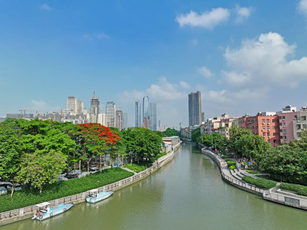 作为天河区仅有的一条途经珠江新城中央商务区的河涌,经过河涌清淤、两岸绿化提升、慢行系统建设等综合整治,如今的猎德涌水质清澈,两岸绿树成荫,治理成效达到“长制久清”标准,成为广州市区的一条重要生态廊道和文化景观带。