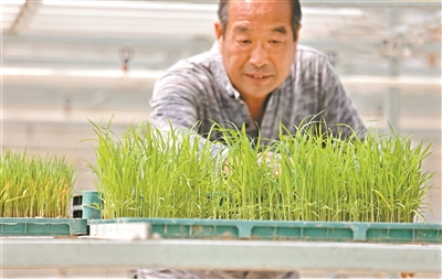增城育秧工厂工作人员老孟在查看秧苗生长情况