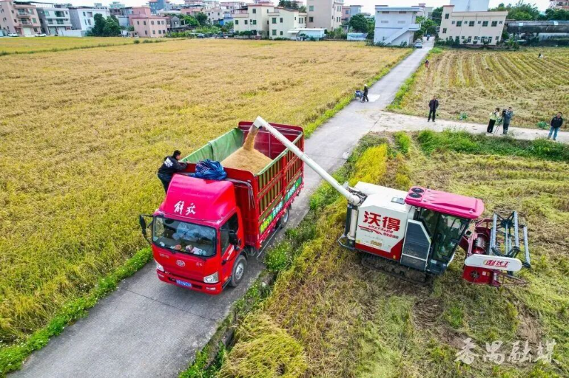 11月12日,花都区梯面镇五联村的广州市市级示范家庭农场迎来了晚稻成熟期。开收割机的师傅动作娴熟老练,收割机正在收割沉甸甸的稻谷,确保颗粒归仓!不时将装满粮仓的稻谷输送到货车上,看到颗粒饱满的稻谷,示范农场负责人喜上眉梢。