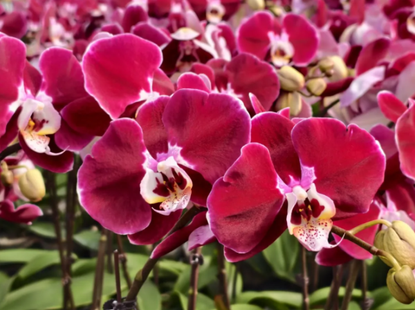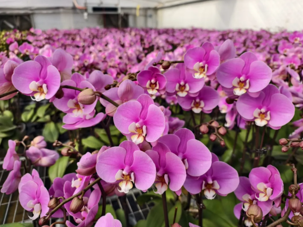 一株株蝴蝶兰舒展花茎,粉白、浅紫等花色清雅脱俗;玫瑰海棠花团锦簇,叶片翠绿鲜亮;一品红似火绽放,百合舒展如炬,玫瑰海棠五彩绚烂,各类年宵花在智能温控系统调控下长势喜人。