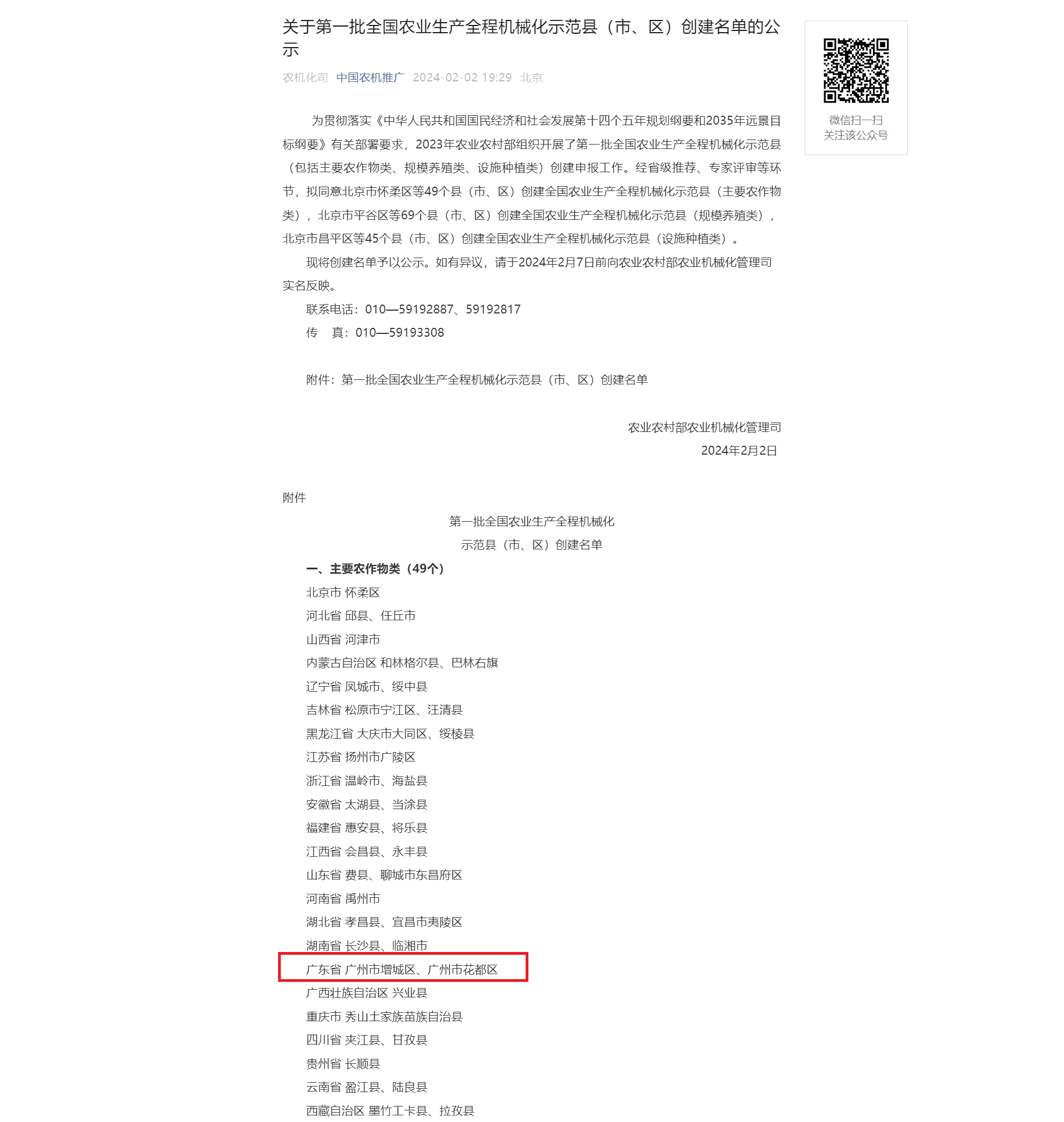 近日,全国49个县(市、区)被农业农村部列入第一批全国农业生产全程机械化示范县创建名单。增城区位列其中,这标志着我区农业生产全程机械化发展迈上了新台阶。