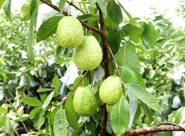 目前是番石榴成熟采摘期,沉甸甸的果实挂满枝头。番石榴果皮比较青时,吃起来清甜脆爽,果肉部分较柔软细嫩。等到果皮渐变黄,吃起来口感香甜软糯,果味浓。