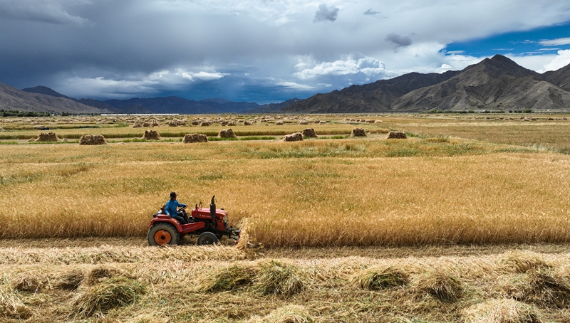 2024年9月10日在西藏日喀则市白朗县巴扎乡拍摄的秋收场景(无人机照片)。