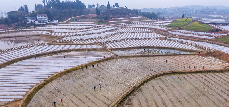 2024年3月6日,在四川省广安市前锋区观塘镇仁和村,农民在高标准农田育秧(无人机照片)。