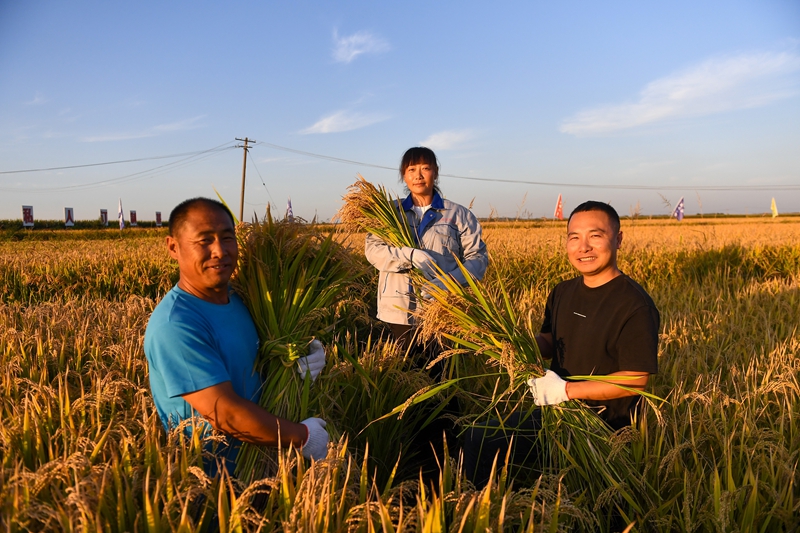 2024年9月20日,在位于吉林省永吉县万昌镇的永吉县禾谷丰水稻种植农民专业合作社,负责人张帅(右一)和两位农民手捧收获的水稻。