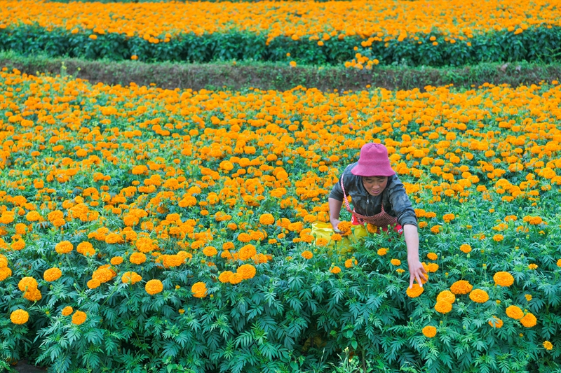 2024年7月30日,村民在贵州省威宁县双龙镇高坡村采摘万寿菊。