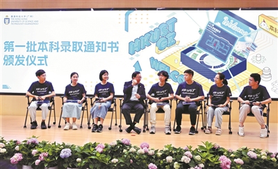7月15日,香港科技大学(广州)(以下简称“港科广”)举行第一批本科录取通知书颁发仪式,7位学子从校长倪明选手中接过了录取通知书。仪式上,港科广校长倪明选表示,虽然港科广是一所新学校,但第一批本科生不是“白老鼠”。“世界一流的实验室就在你们的身边,世界一流的教授也在你们的身边,世界一流的学习资源就在我们身边。”