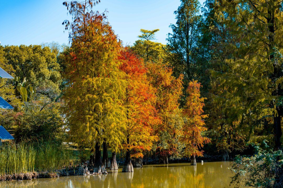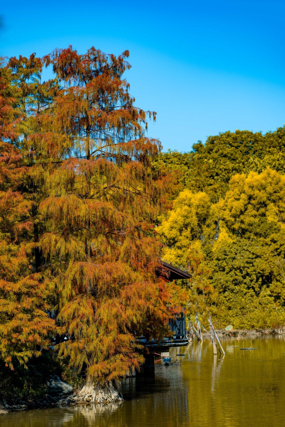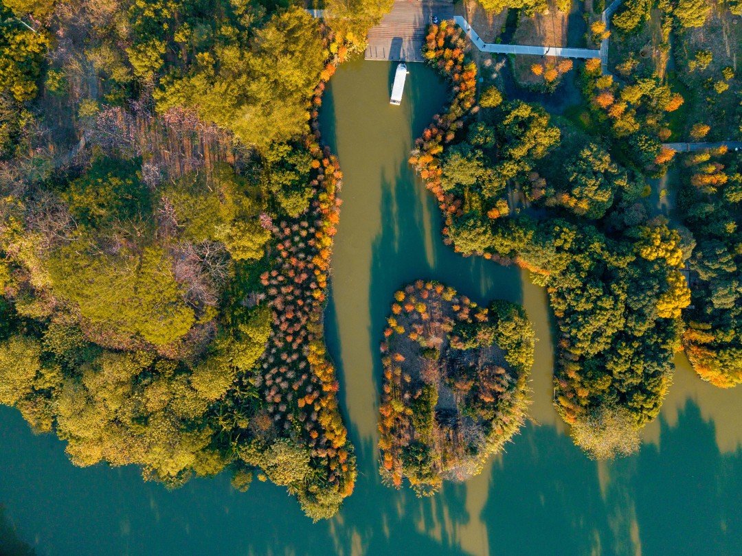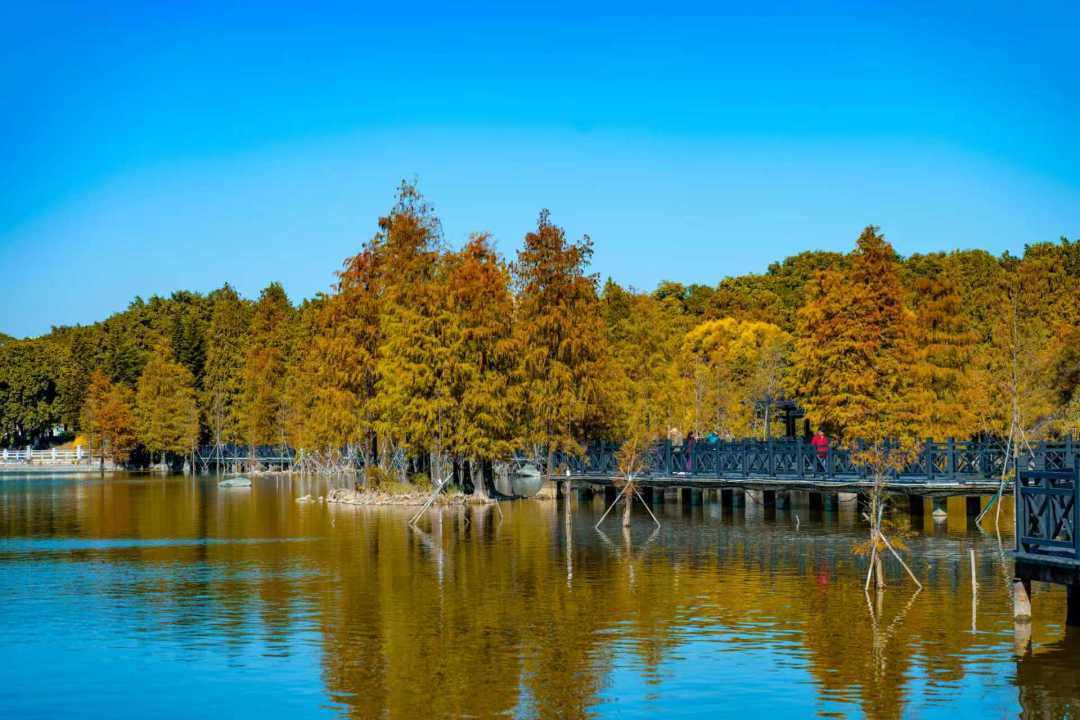 位于湿地一期的友谊林及内河道聚龙湾,则以成排壮观的杉林和静谧的河道景观著称。焦糖色的枝叶垂落水面,阳光透过缝隙洒下斑驳金芒,绿水与红杉相映,营造出宛如童话世界的氛围。此处被许多摄影爱好者誉为“城市秘境”,树干倒映在碧绿水中,色彩浓郁和谐,出片率极高。